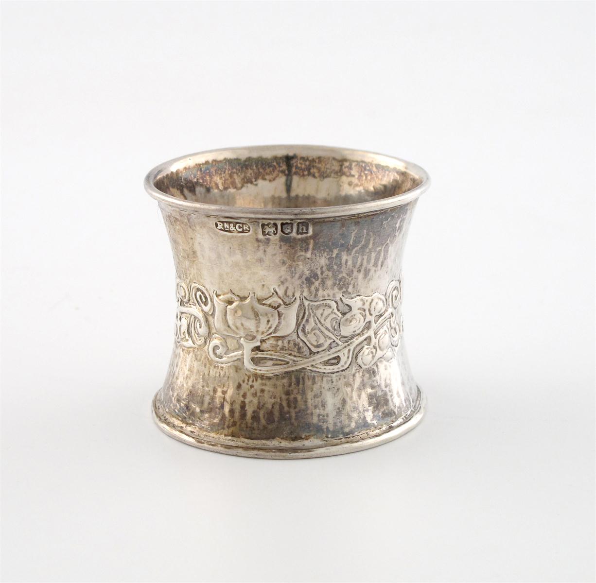 By Ramsden and Carr, an Edwardian silver napkin ring, London 1903, tall waisted circular form, spot-hammered decoration, embossed foliate band, height 4.3cm, approx. weight 1oz.