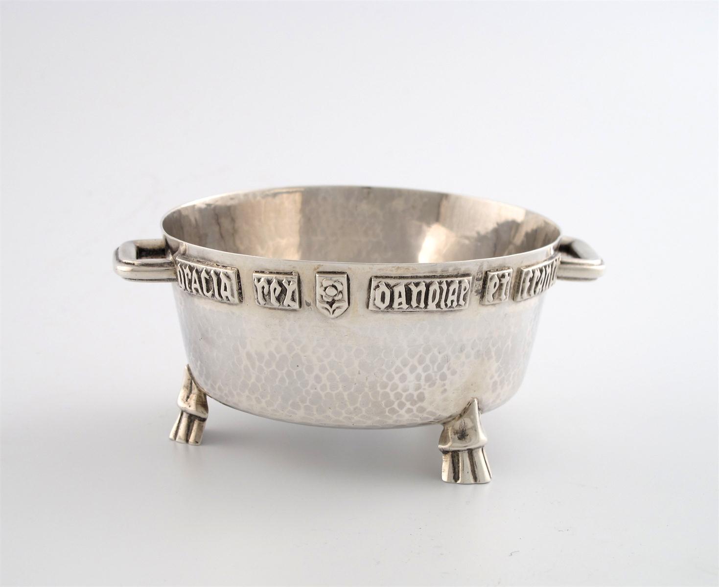 tapering circular form, spot-hammered decoration, with applied text, on three fluted bracket feet, diameter 10.2cm, approx. weight 5.9oz.
