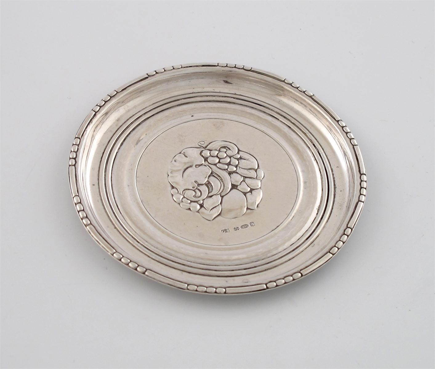 circular form, embossed foliate decoration, spot-hammered decoration, beaded border, diameter 8.2cm, approx. weight 1oz.