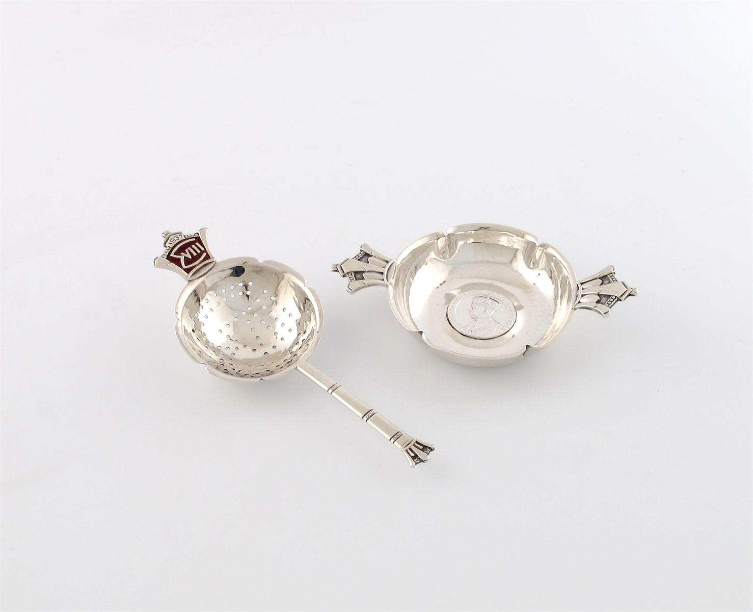 the tea strainer with a red enamelled crown with EVIII, the quaich with crown side handles and set with a coin, approx. total weight 3oz. (2)