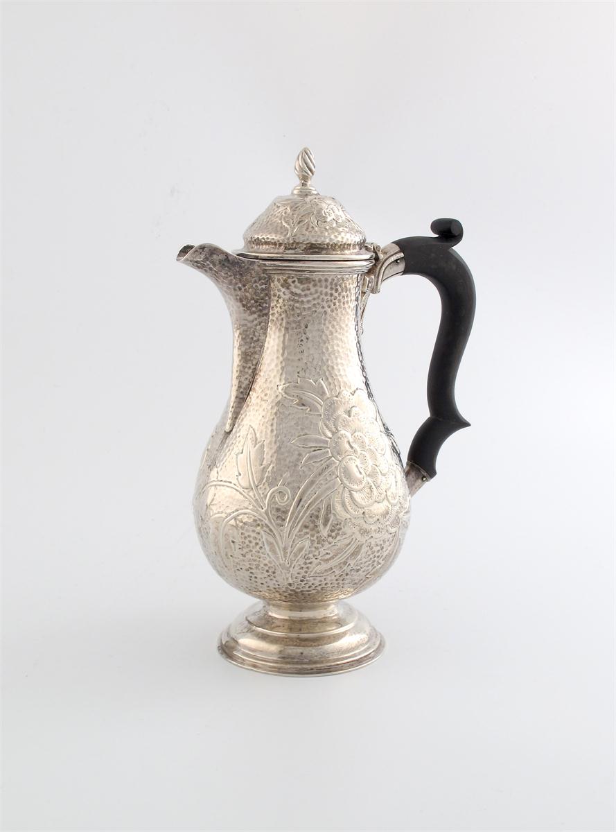 baluster form, embossed with flowers on a spot hammered ground, scroll handle, on a raised circular foot, height 23.5cm, approx. weight 13oz.