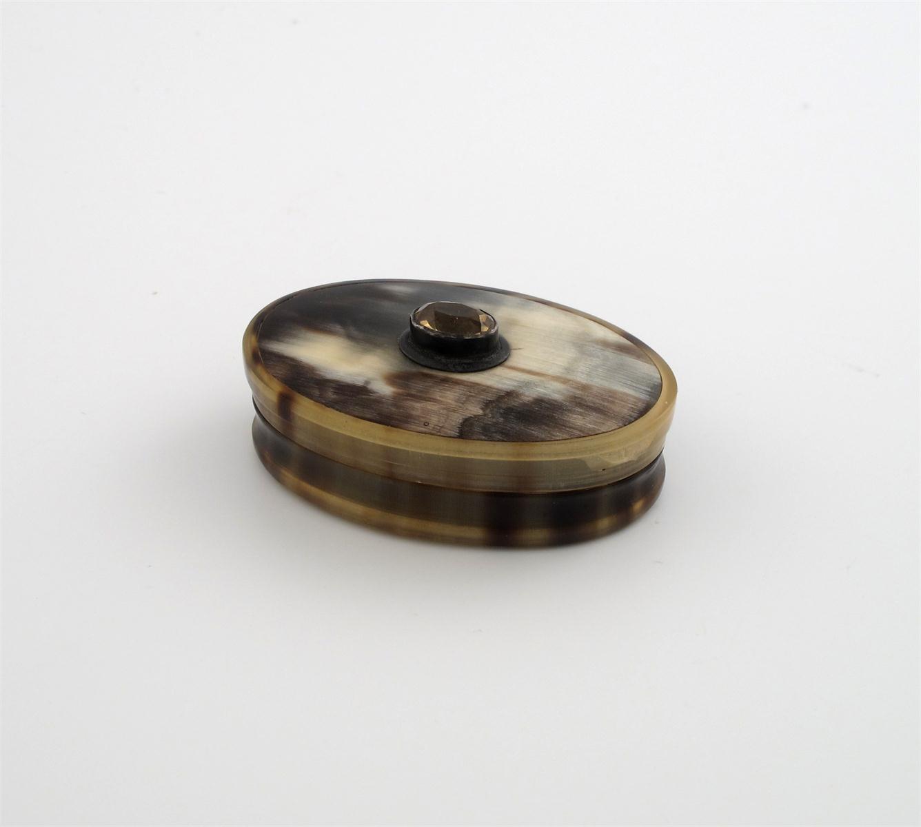 A Scottish silver mounted horn snuff box, unmarked, oval form, mounted with a yellow stone, length 7.3cm.