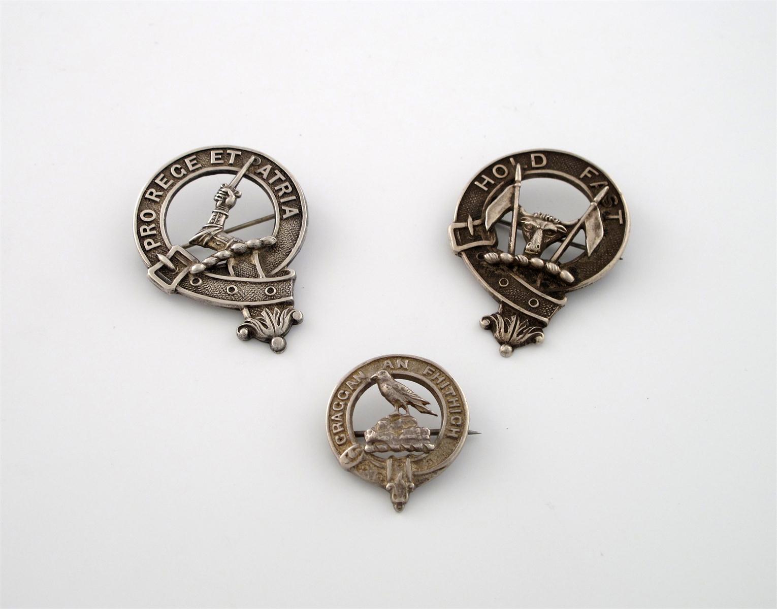 modelled as a bull's head and two flags and with a strap and motto 'HOLD FAST', diameter 3.5cm, plus another silver clan badge, Cameron, same date and maker, modelled as an arm holding a short sword and with a strap and motto 'PRO REGE ET PATRIA', diameter 3.5cm, and another clan badge, Macdonnell, approx. weight 1.2oz. (3)