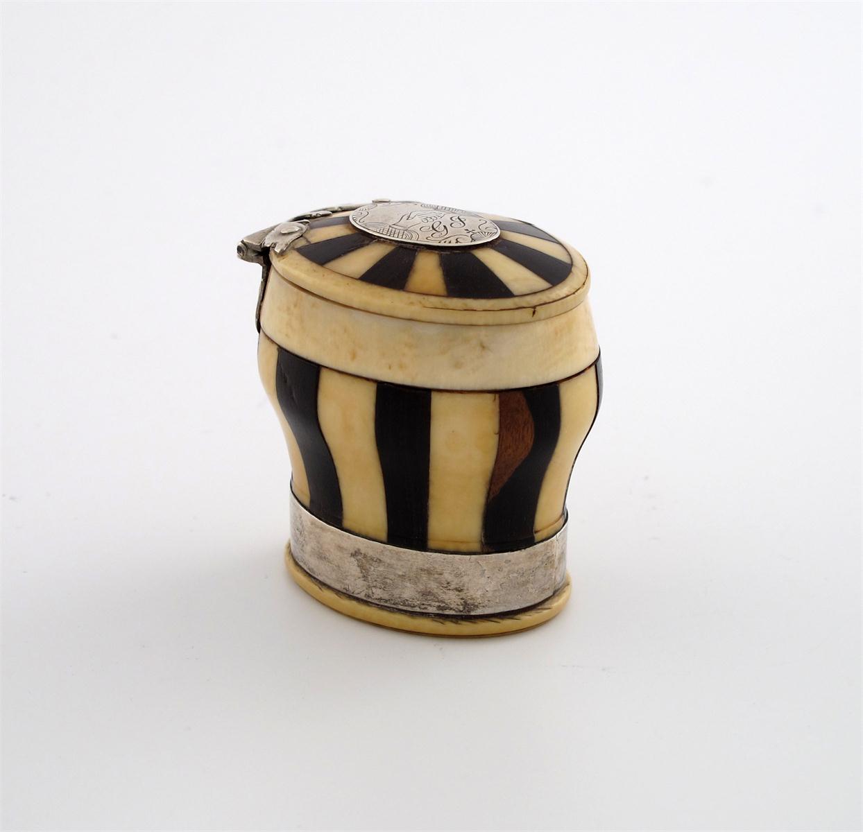 upright waisted form, decorated with alternating strips, the body with a later silver band, the hinged cover set with an oval silver plaque engraved with two shaking hands and initialled 'G.F'. height 5.3cm.