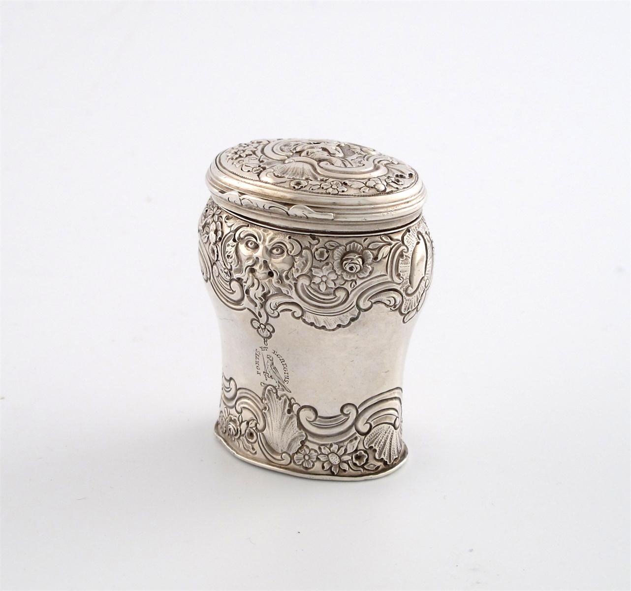 upright waisted form, chased foliate scroll decoration, the hinged cover with a Rococo female figure, the front with a later crest and motto, scratch engraved to base 'The gift of Wm. Dowling Esq. to Geo. Thompson' height 5.3cm.