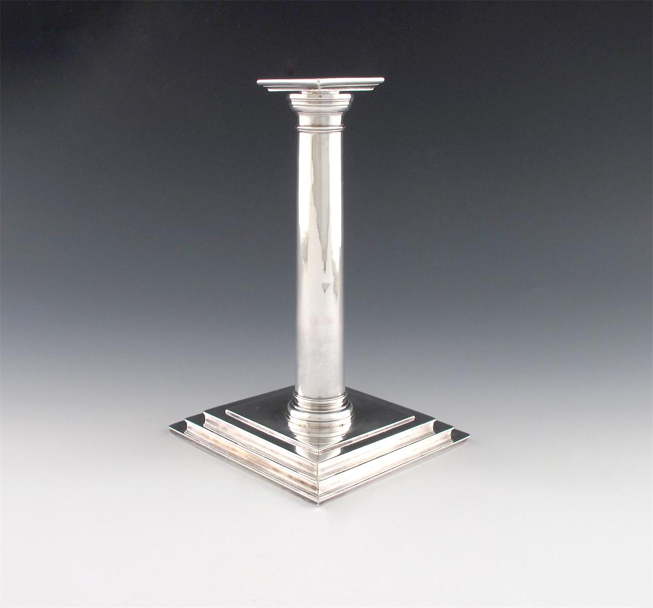 with a plain column and a removable drip pan, on a spread stepped square base, the underside with a scratch weight 27:2, the drip pan with a scratch weight 2:0 1/2', height 21.4cm, approx. weight 28oz.
