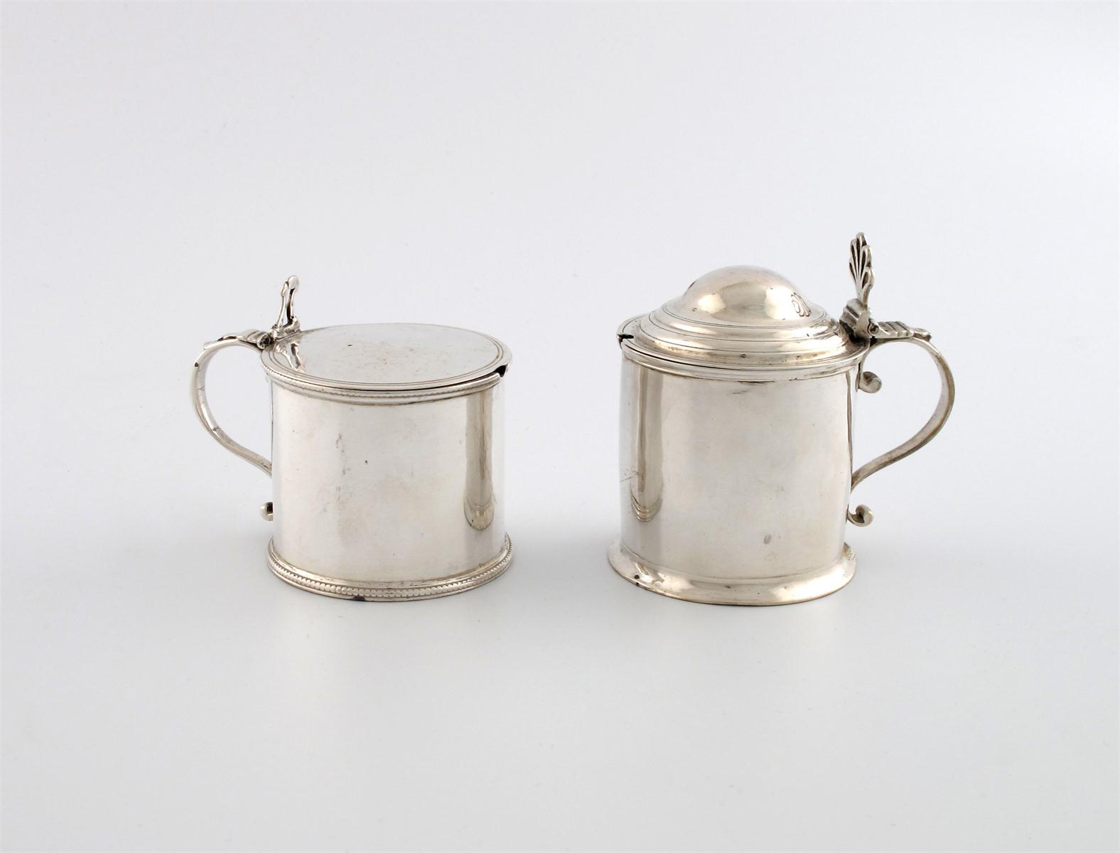 plain drum form, beaded borders, the hinged cover with a pierced thumb-piece, with a blue glass liner, plus another George III silver mustard pot, London 1774, circular form, domed hinged cover with a pierced thumb-piece, height 8.3cm, approx. total weight 7.4oz. (2)