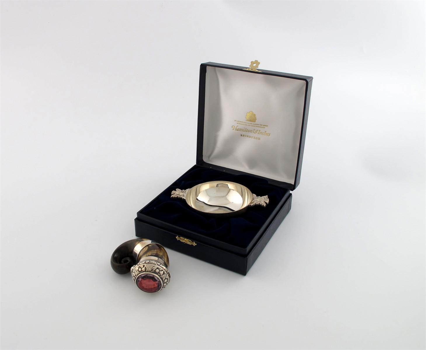 the hinged cover with embossed foliate decoration and set with a pink glass cabouchon, plus a modern Scottish silver quaich, by Hamilton and Inches, Edinburgh 1996, thistle handles, in a fitted case, approx. weight 3oz. (2)