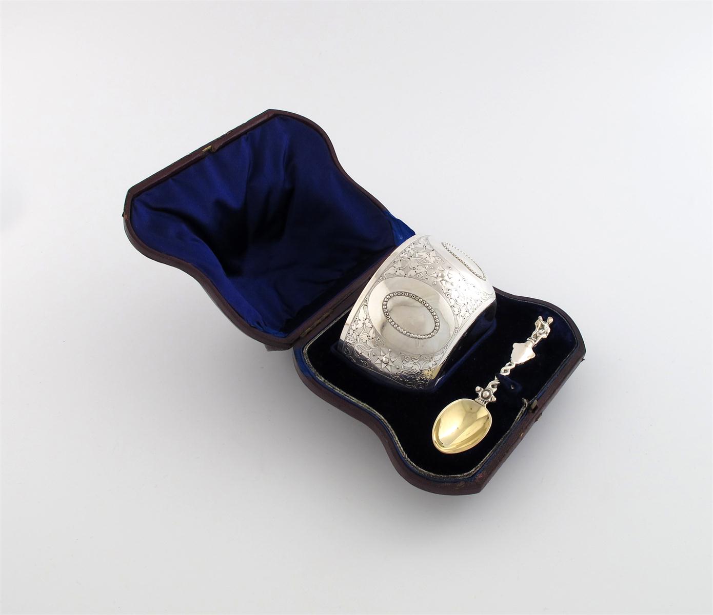 circular form, chased foliate scroll decoration with oval beaded cartouches, the spoon with a pierced handle and figural terminal, in a fitted case, diameter 9.7cm, approx. weight 4.9oz.