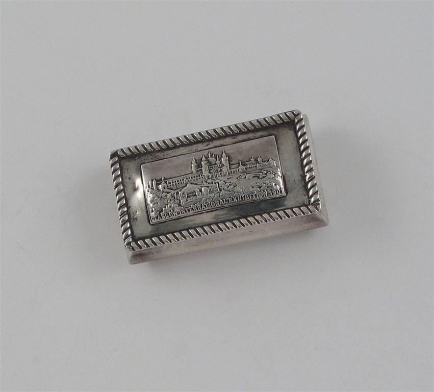 Glasgow Souvenir: a late Victorian oblong box, with a hinged cover, stamped with a plaque depicting "Glasgow International Exhibition 1901", by Deakin & Francis, Birmingham 1900, 2.75in (7cm) 1.5oz.