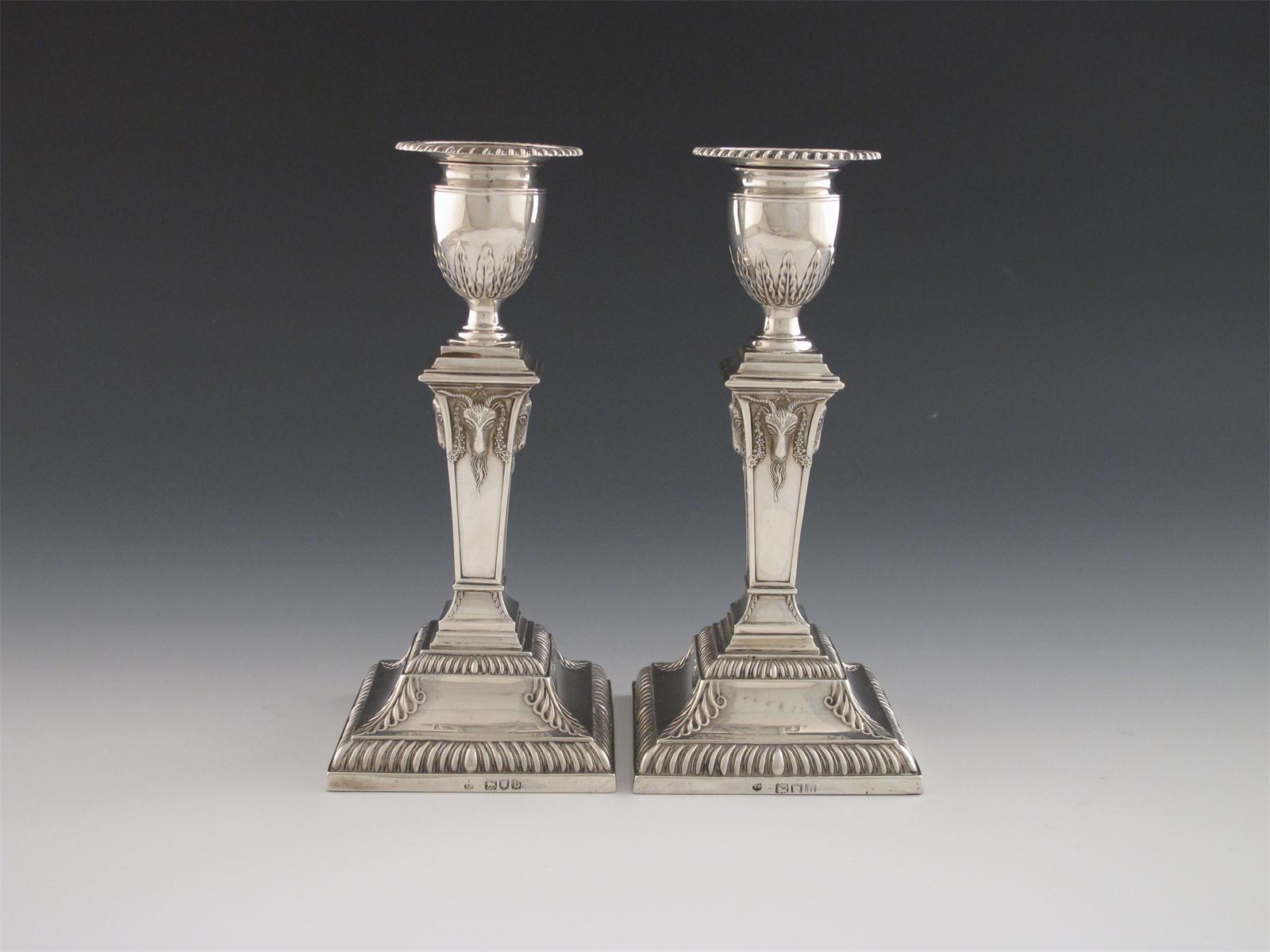 tapering square form, gadroon borders, foliate corners, urn shaped capitals, height 18.5cm. (2)
