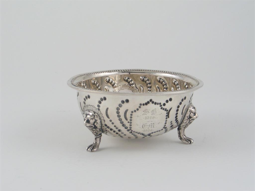 A George III Irish sugar bowl, with punch beading and lion mask and paw feet, initialled and dated on one side, Dublin 1771, 5.5in ( 14cm) diameter, 7oz.