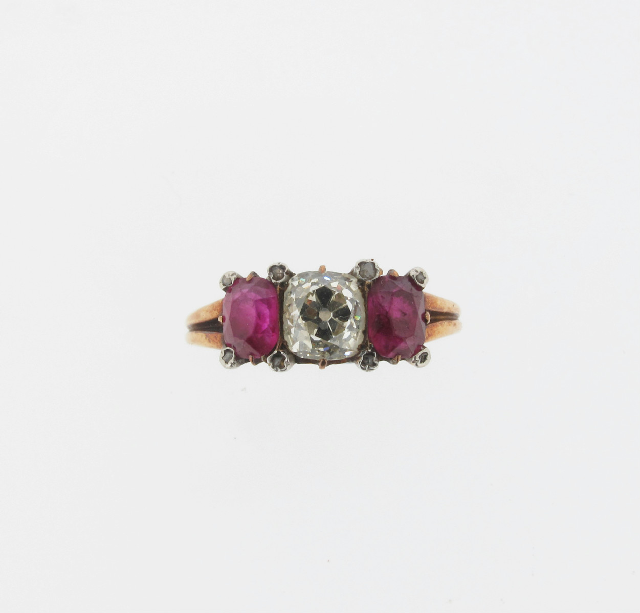A diamond and ruby three stone ring, the cushion shaped diamond is set with two oval shaped rubies in gold. With smaller rose cut 'pointer' diamonds. Size R. Heart shaped fitted leather case.