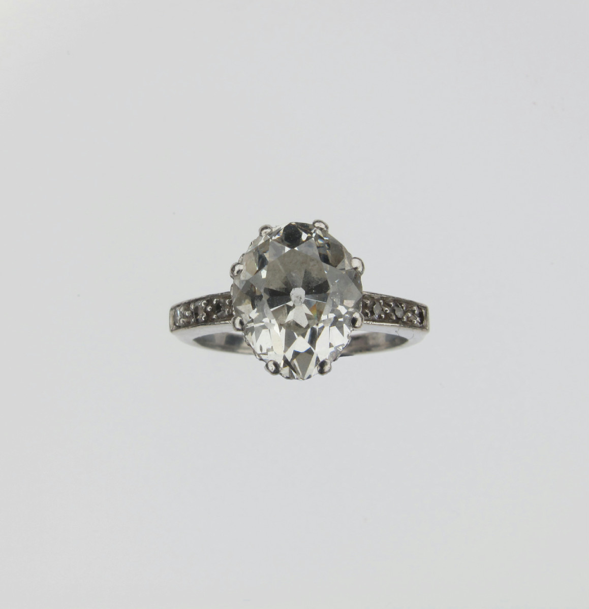 A diamond solitaire ring, set with an old pear shaped diamond which weighs approximately 2.15cts and is set in a modern platinum mount with six small shoulder diamonds. Size I 1/2.