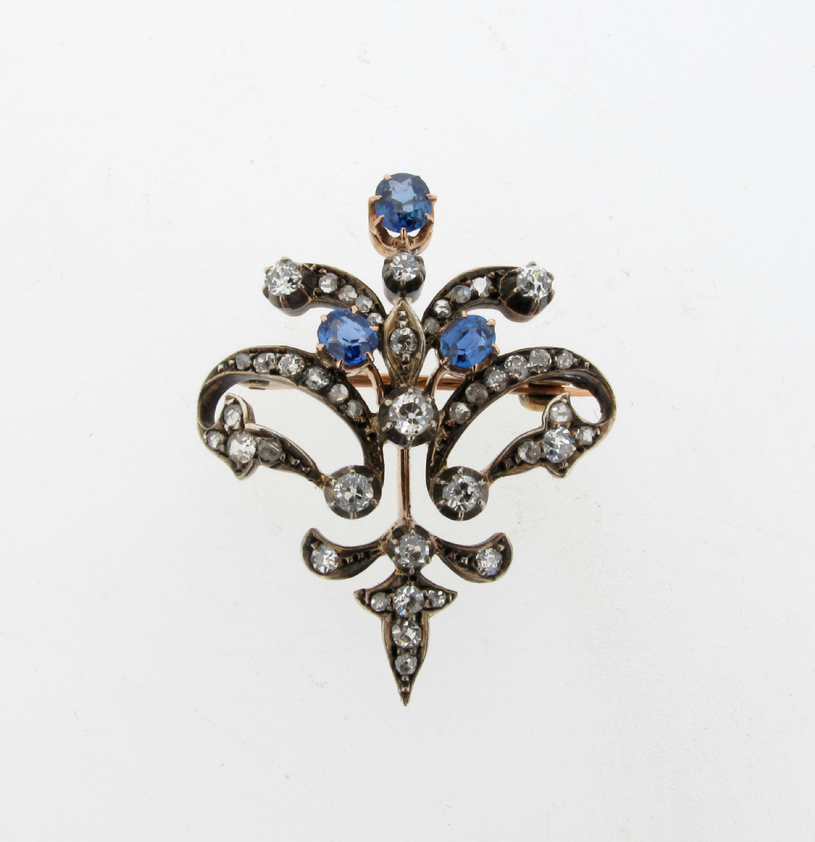 A late Victorian stylised foliate brooch, set with graduated circular cut diamonds and three sapphires in silver and gold. 3.5cm high.
