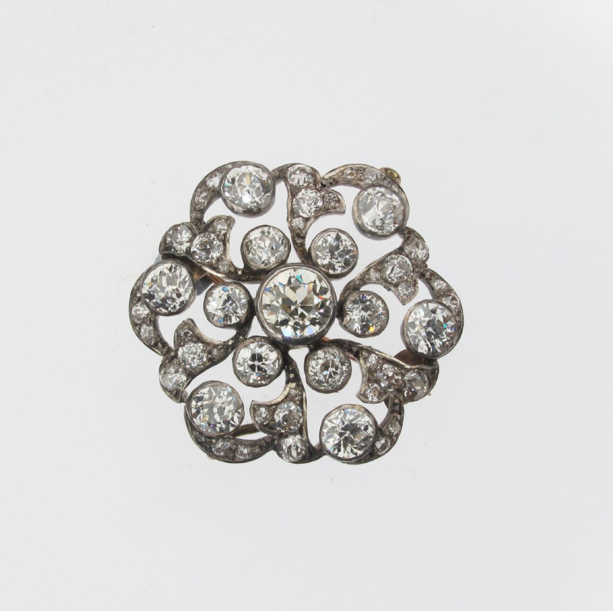 A late Victorian diamond foliate brooch, the centre old brilliant cut diamond weighs approximately 1.05cts and is set in a surround of six smaller diamonds and a further surround of six larger diamonds in silver and gold. The twelve smaller surrounding diamonds weigh approximately 3.60cts in total. With pendant loop and a smaller folding suspending loop.