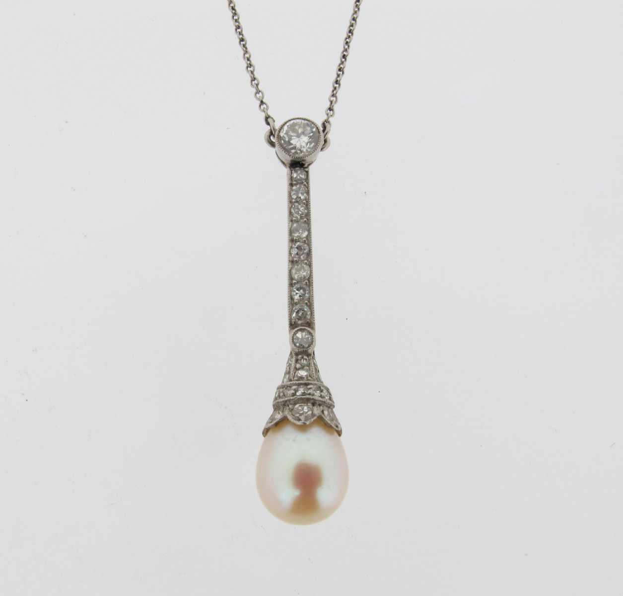 A pearl and diamond pendant, the pearl suspends from a line of diamonds with larger millegrain set circular cut diamond to the top. Set in platinum. On a fine link platinum neck chain. Accompanied with certificate number 06106 from The Gem and Pearl Laboratory dated 15th August 2012 stating that the part-drilled pearl is natural (saltwater).