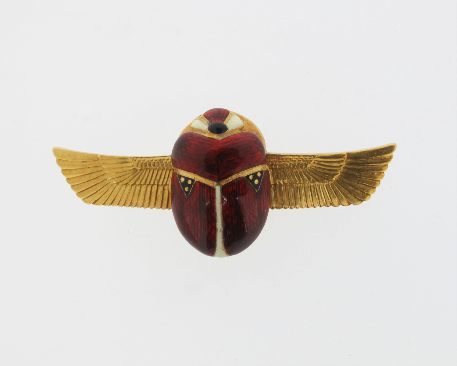 A 19th Century gold and enamel scarab brooch, the stylised scarab decorated with cream, black and red guilloche enamel. Realistically formed wings. Glazed locket compartment to the reverse. 5.7cm wide.