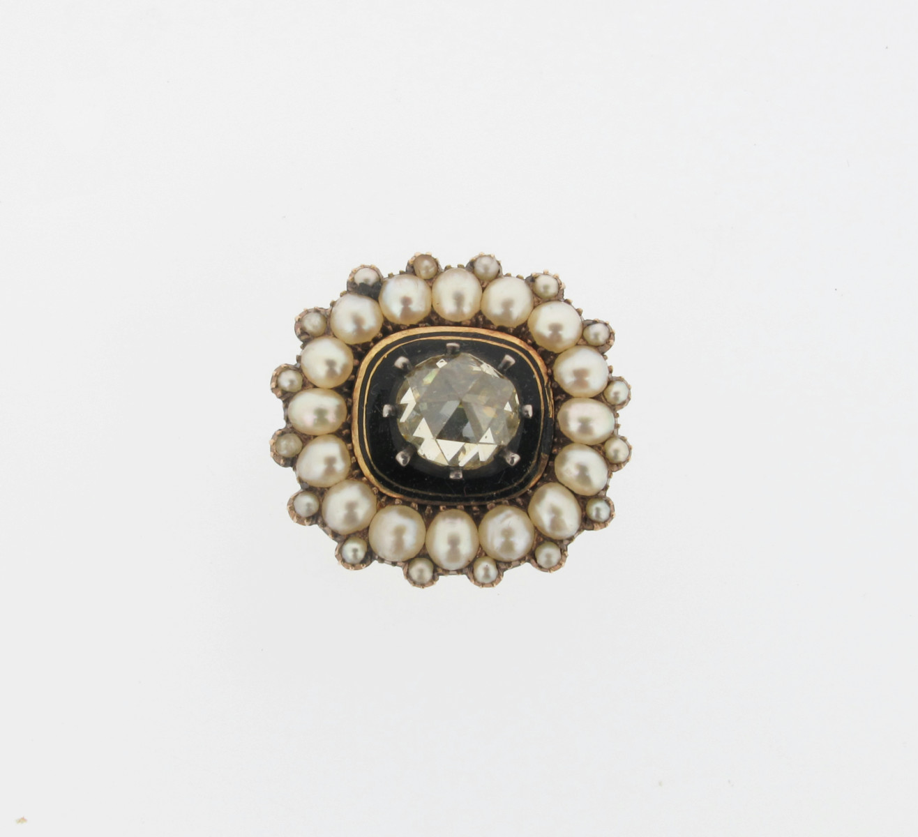 A George III mourning brooch, centred with a rose cut diamond on black enamel ground within two gold borders, with further surrounds of graduated pearls on gold. 2.2cm wide.