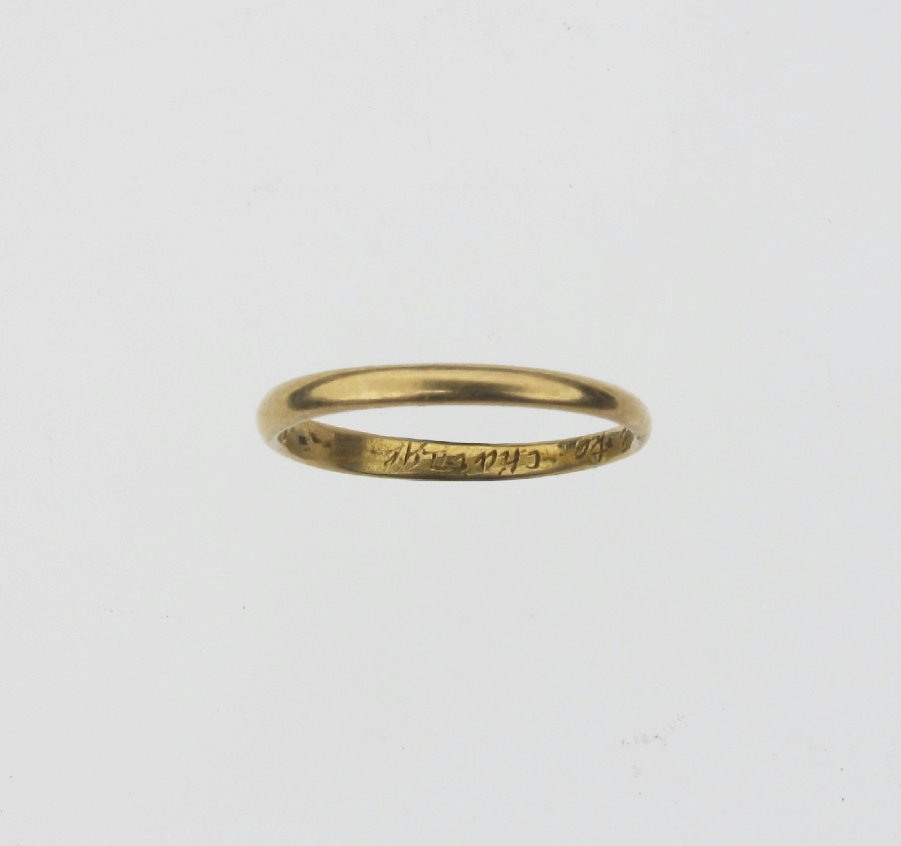 A small gold posy ring, engraved to the interior 'I Like My Choyfe To Well To Chainge' 1.0g. Size F 1/2.