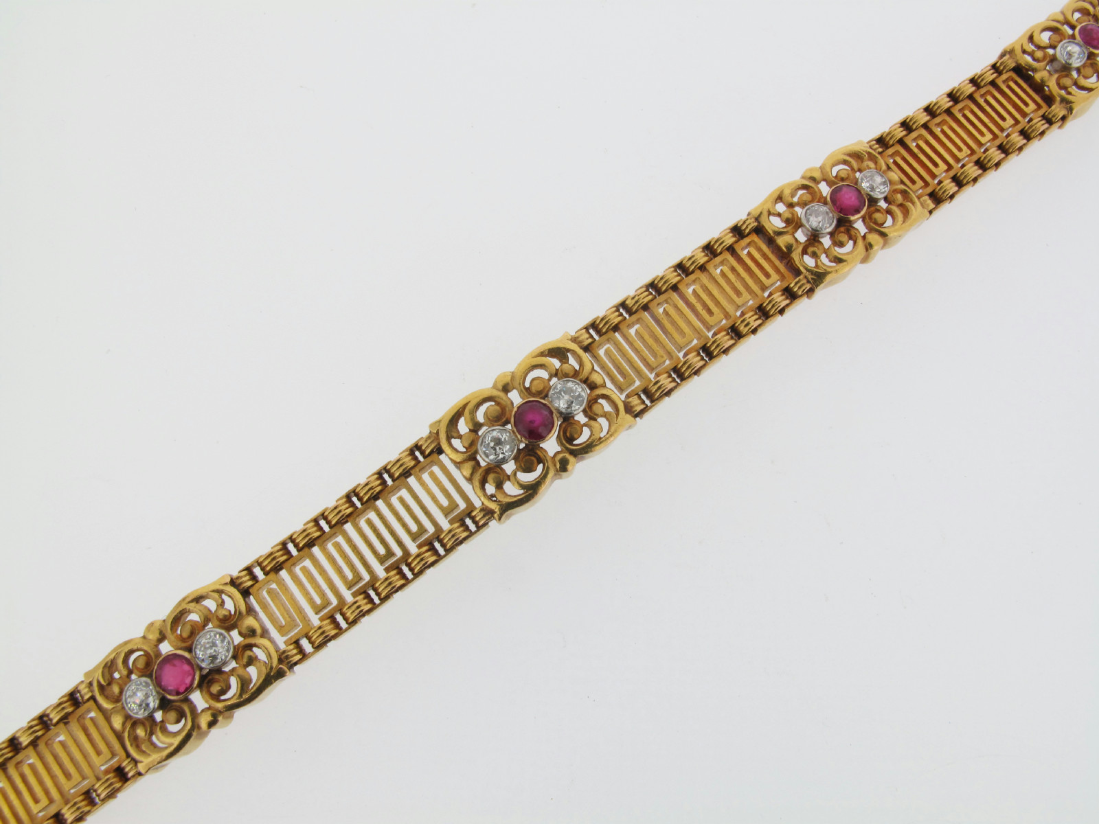 A French gold bracelet set with rubies and diamonds, mounted with five scroll pierced rectangular sections, each set with a ruby and two circular cut diamonds, joined with Greek key pattern form links marked MD, indistinct makers lozenge. French control mark and numbered 10197 5. 19cm. 34g.