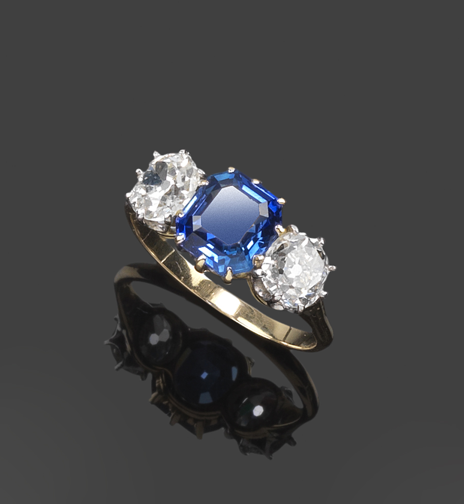 A sapphire and diamond three stone ring, the octagonal cut sapphire weighs approximately 4.20cts and is set with two cushion shaped diamond which weigh approximately 2.25cts in total. Set in platinum and yellow gold with pierced coronet settings and yellow gold shank. Size V 1/2.