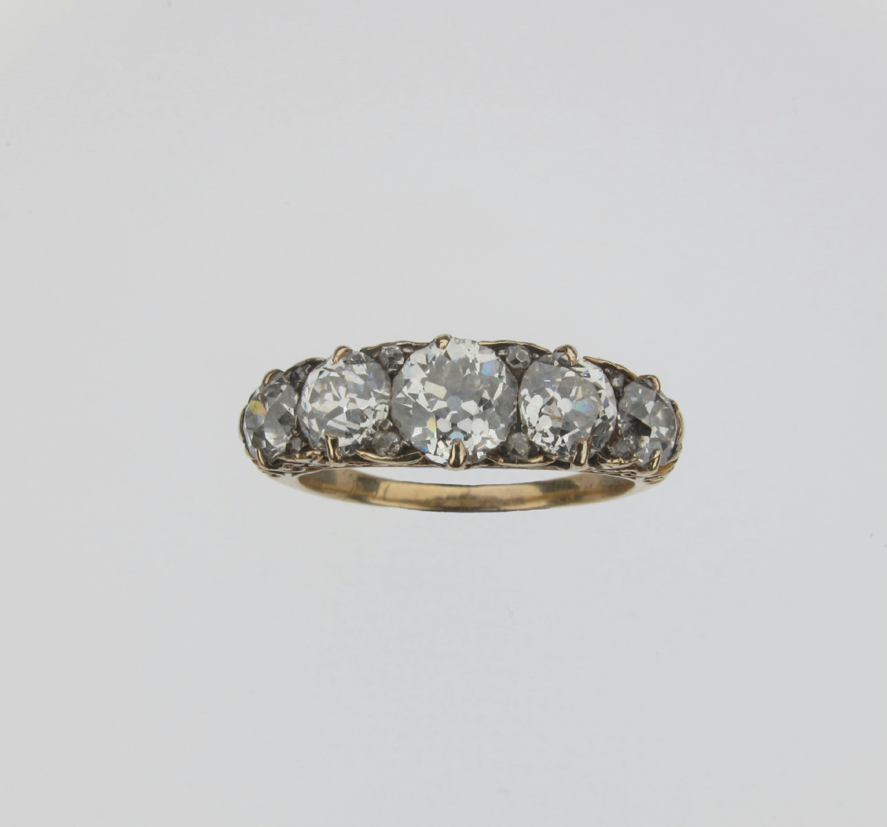 A diamond five stone ring, the five graduated old circular cut diamonds are set in yellow gold with eight small rose cut 'pointer' diamonds, foliate scroll carved shoulders. Size Q 1/2.