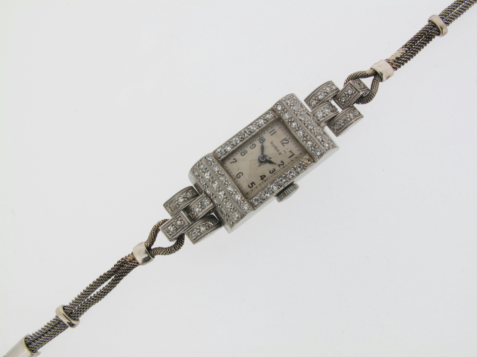 A ladies white gold diamond set dress wristwatch by Rolex, the signed rectangular dial with black Arabic numerals. Diamond set to the bezel and shoulders. Movement signed Rolex (twice). Fifteen robies. 9ct white gold mesh band.