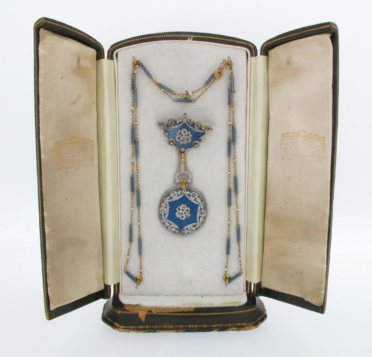 An early 20th Century open faced fob watch, the gold dial with black Arabic numerals and subsidiary seconds dial and blue guilloche enamel decoration to the bezel and reverse and applied with scroll designs set with small diamonds, suspended from a gold brooch with similar diamond and enamel decoration with a gold neck chain mounted with seed pearls and blue enamel cylinder links. The inner case signed Oscar Fresard and numbered 48175. The chain 32cm long with an associated Cartier box.