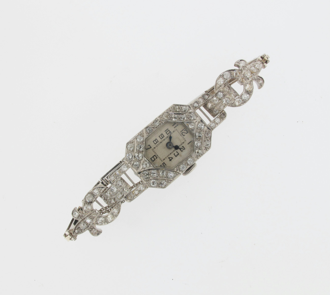 A ladies diamond set dress wristwatch, the plain white dial with black Arabic numerals, the platinum case and band set with graduated circular cut diamonds. Expanding band.