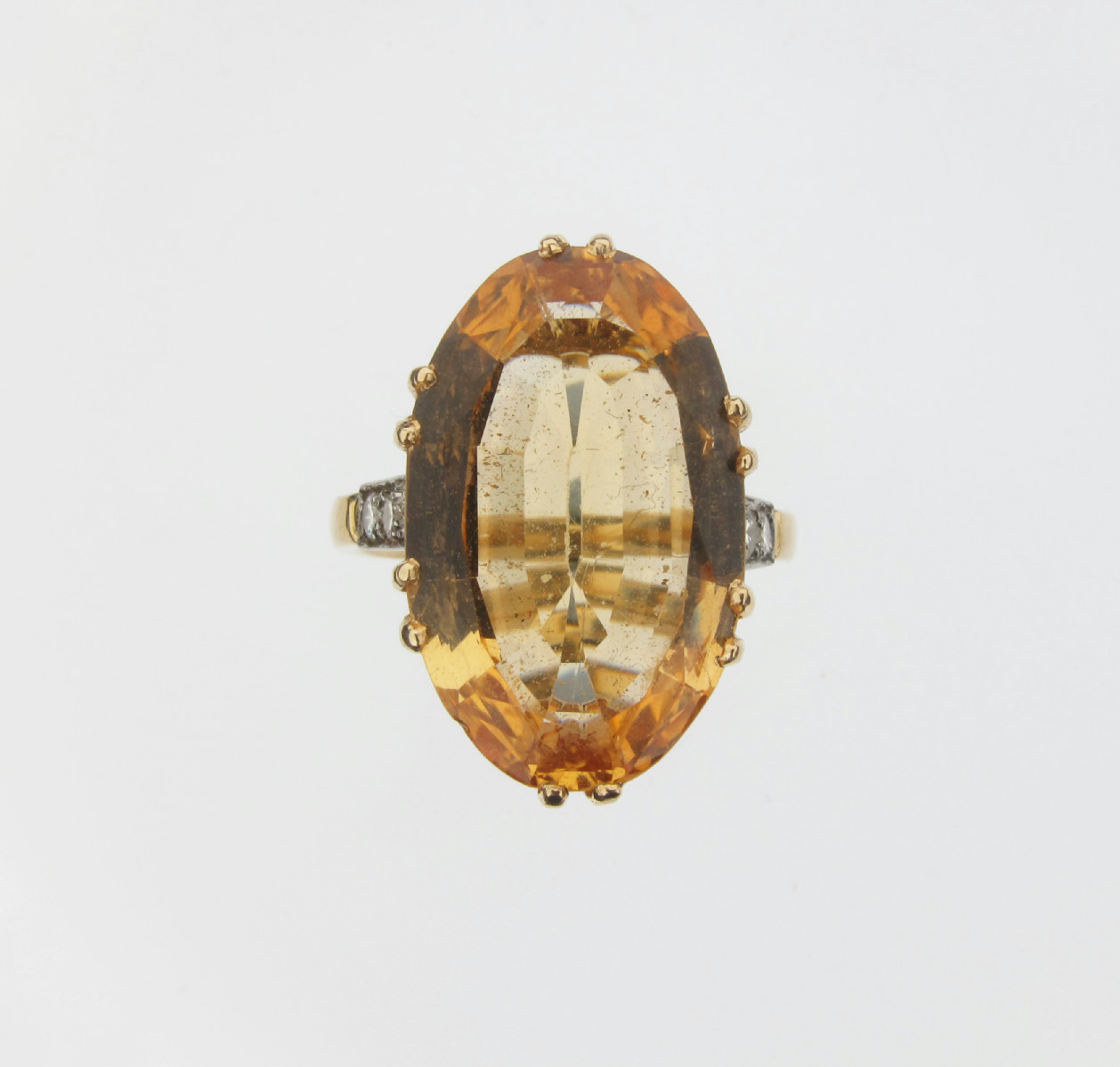 A topaz and diamond ring, the oval shaped topaz is set with six circular cut shoulder diamonds in 18ct yellow gold and platinum. Size T.
