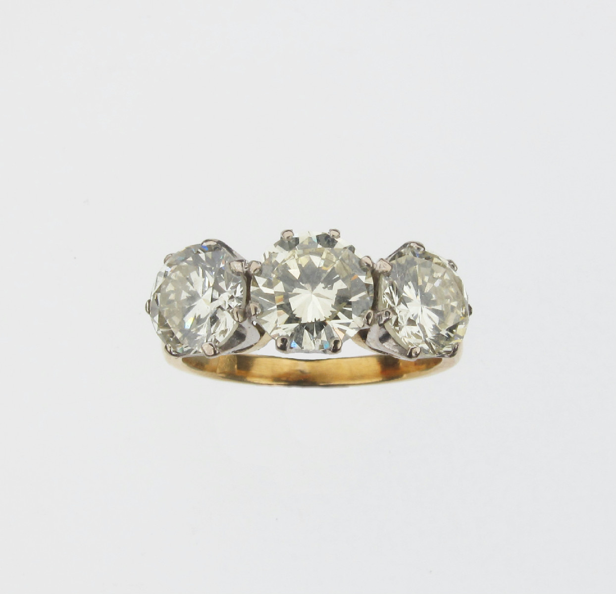 A diamond three stone ring, the three circular brilliant cut diamonds weigh approximately 2.85cts in total and the centre stone weighs approximately 1.02cts. Set in yellow and white gold. Size L 1/2.