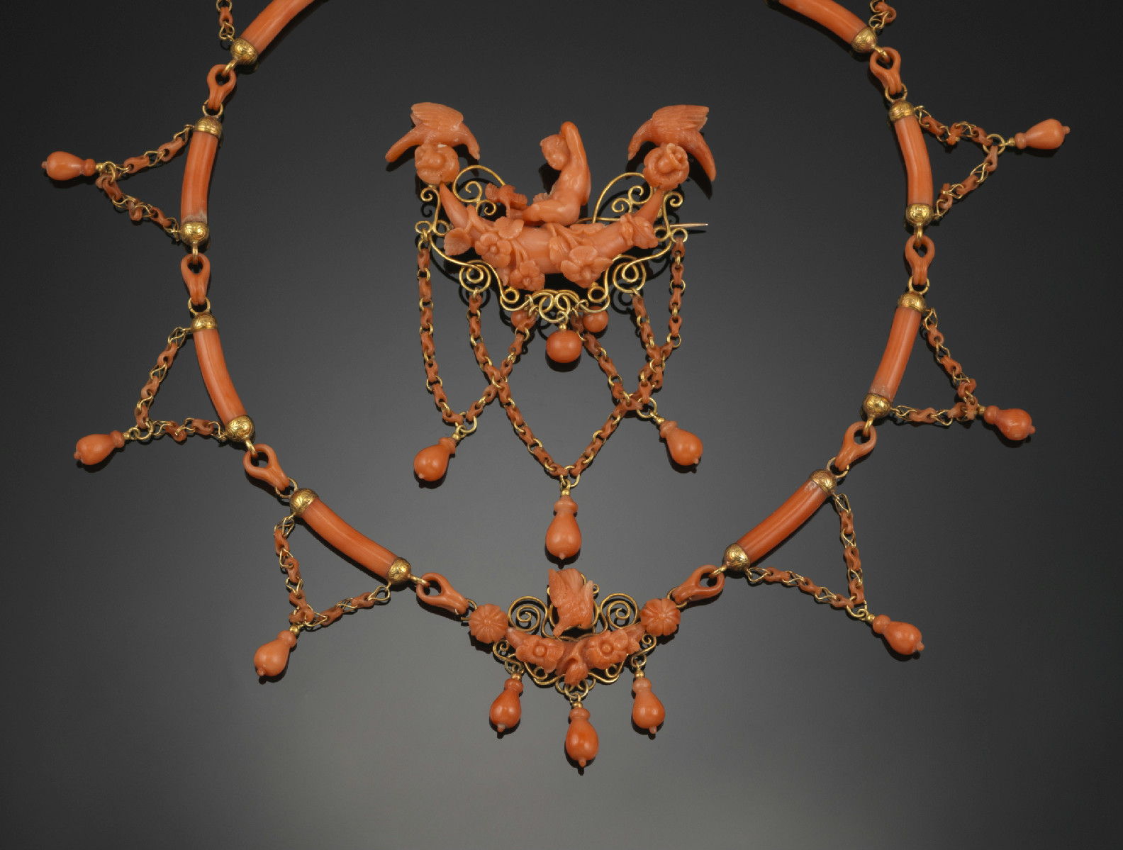A 19th Century coral festoon necklace and matching brooch, with gold mounts to the carved coral sections. The necklace 43cm long.