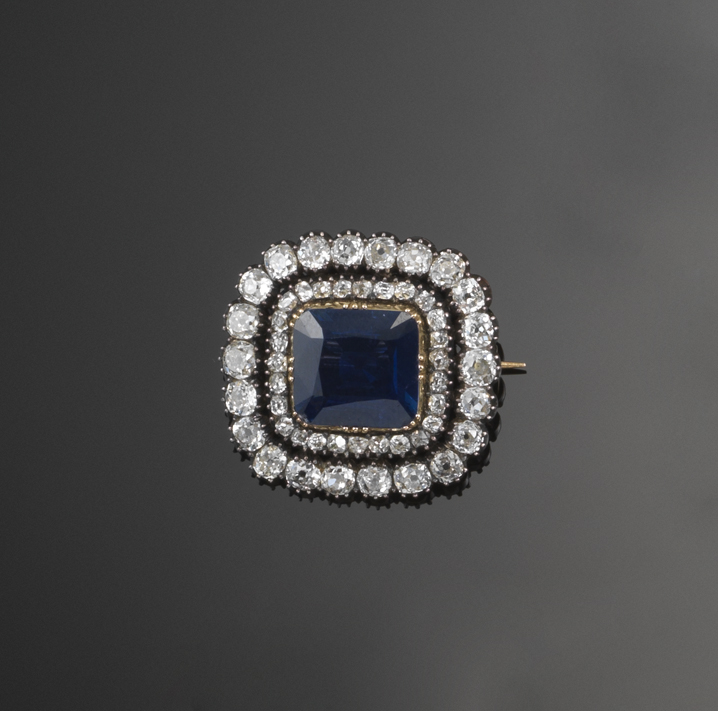 A Victorian sapphire and diamond brooch, the cushion shaped sapphire is mounted in a gold cut down collet within a surround of cushion shaped diamonds and a further border of larger cushion shaped diamonds. In silver and gold. Fitted case.