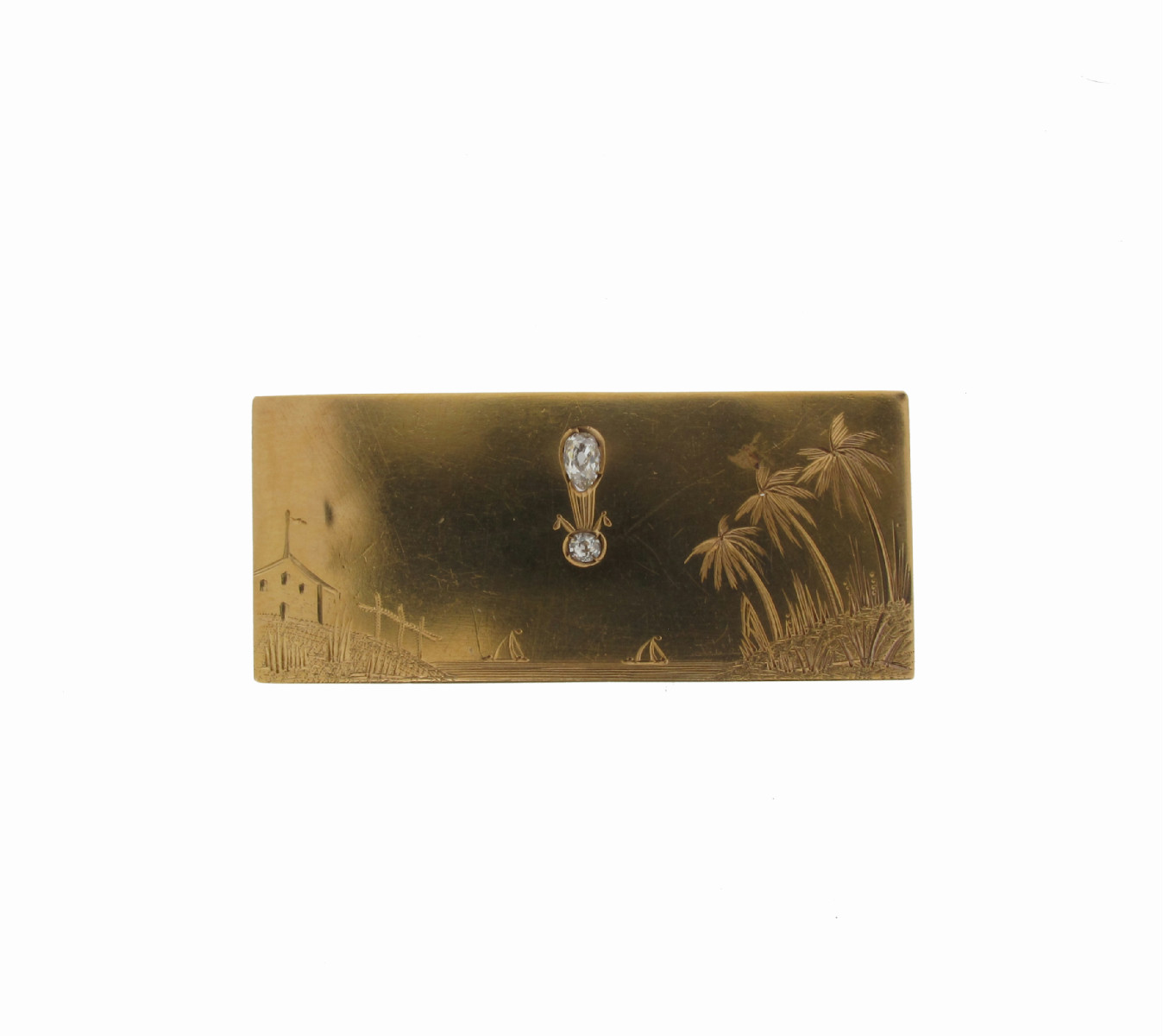 A 19th Century gold rectangular brooch of ballooning interest, centred with an engraved balloon with two flags and set with a pear shaped and circular cut diamond. The balloon floats above an engraved seascape with two yachts, a building to the left and coconut trees to the right. The reverse engraved 'Marco 28 1897' Marco is Portuguese for March and consequently the scene could be to commemorate a ballooning incident from a Portuguese colony, possibly South America. 4.7cm wide.
