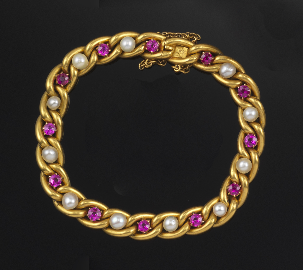 A French gold curb link bracelet, the frosted links alternately mounted with pearls and circular cut rubies. 22g.