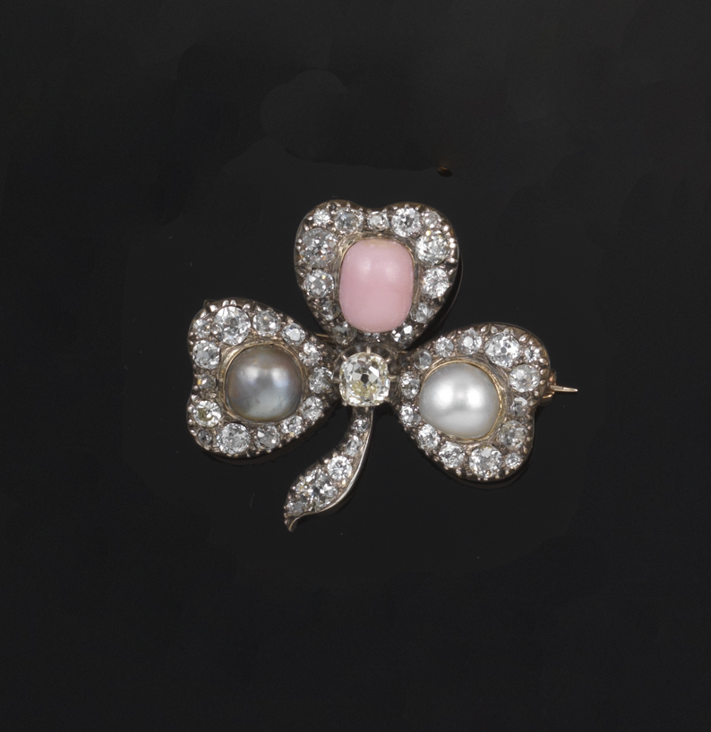 A Victorian stylised shamrock brooch, the three heart shaped petals each centred with a conch pearl, a black pearl and a white pearl. All within surrounds of graduated cushion shaped diamonds and centred with a larger diamond. Set in silver and gold. 3.2cm wide. Fitted case.