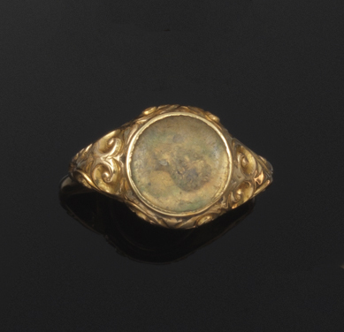 A gold memorial ring for the Duke of Wellington, the centre glazed circular section covers a relief profile of the Duke of Wellington. Scroll carved shoulders, glazed locket compartment to the reverse. Size I.