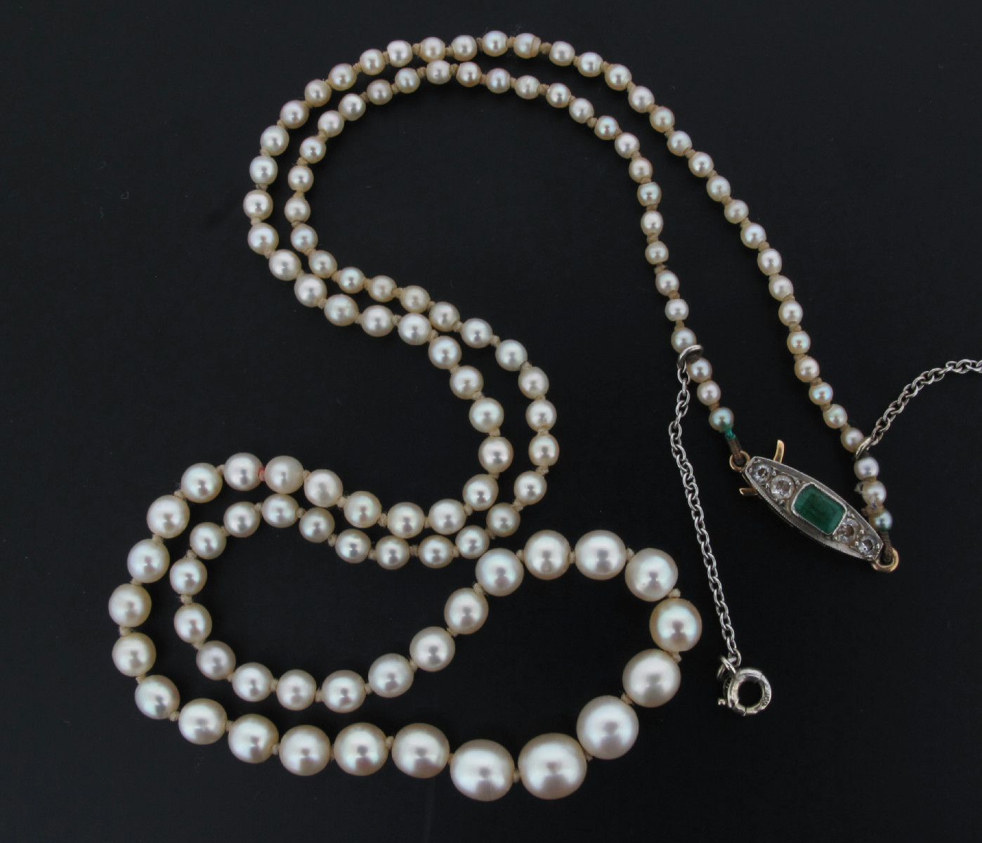 A single row graduated pearl necklace, the pearls graduate from 2.1 - 5.7mm with a navette shaped gold and platinum clasp set with an emerald and four diamonds, French control marks to the tongue. 47.5cm.