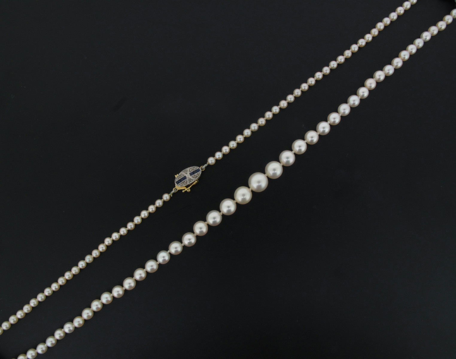 A single row graduated pearl necklace, 50cm. The small gold oval clasp set with calibre cut sapphires. Accompanied with certificate number 06030 from The Gem and Pearl Laboratory dated 20th July 2012 stating that the 119 pearls graduate from 2.7mm - 6.9mm, weigh 10.83g (total) are are natural saltwater pearls.