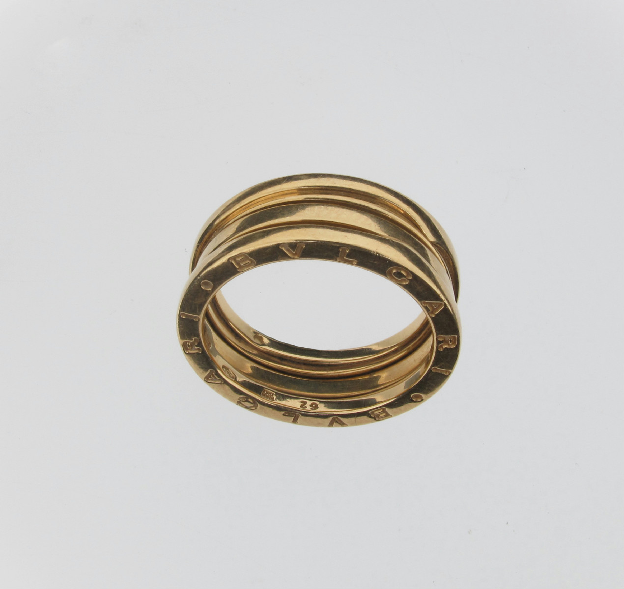 A yellow gold expanding three section ring, twice engraved 'Bulgari' to each side. Stamped 622. 10g in total. Size T. With box and outer case.