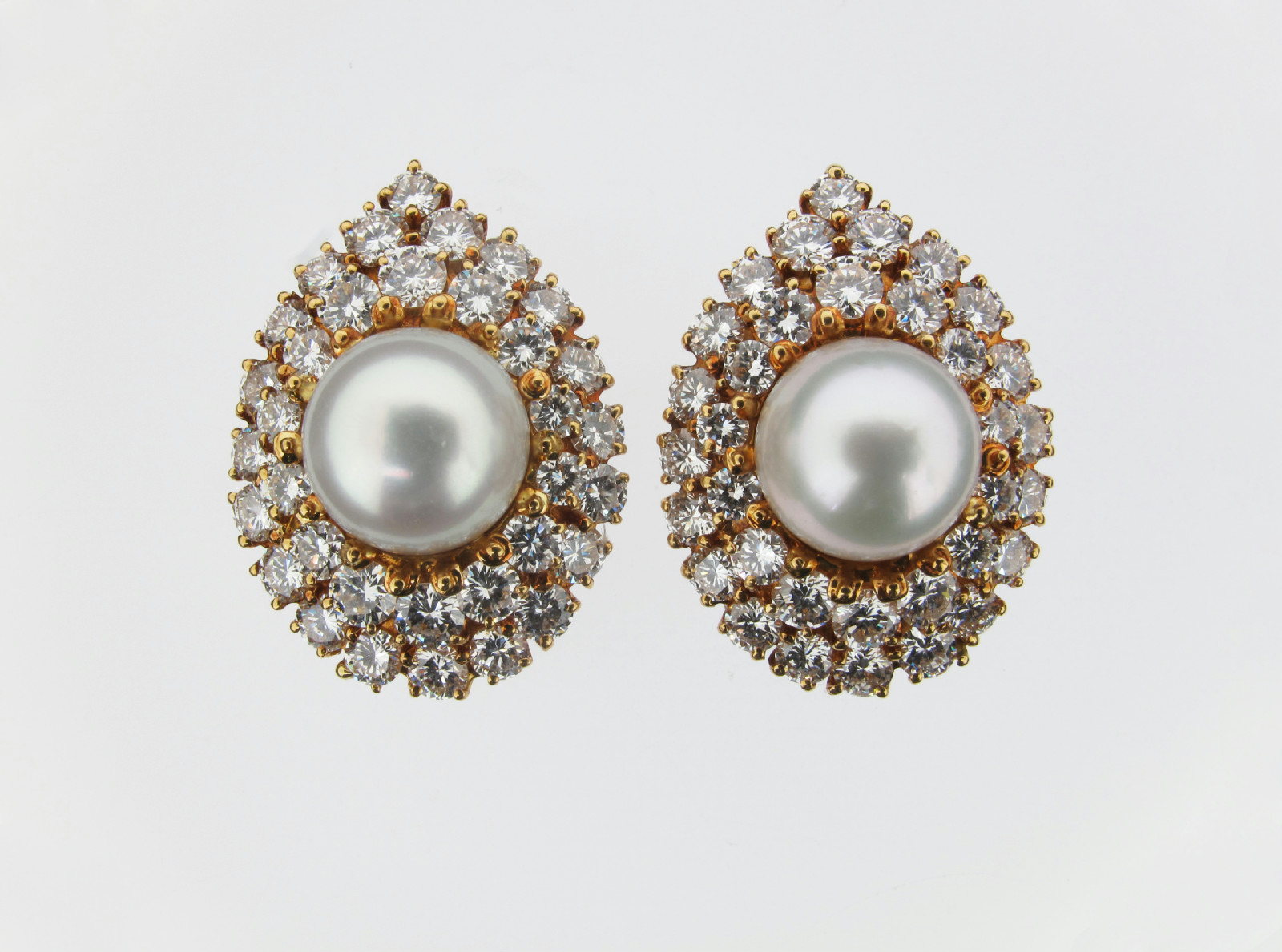 A pair of pear shaped cultured pearl and diamond set earrings, the pearls are set within two rows of circular brilliant cut diamonds in yellow gold.