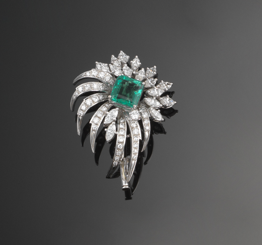 An emerald and diamond set foliate brooch