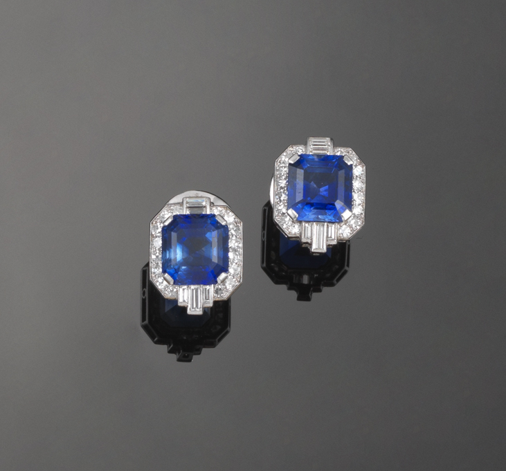 A pair of sapphire and diamond cluster earrings, each centred with an octagonal cut sapphire within a circular and baguette shaped diamond surround. White gold. Believed to be untreated.
