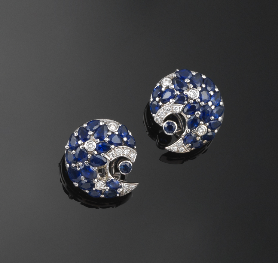 A pair of swirl earrings, pave set with round and pear shaped sapphires and circular cut diamonds in platinum. Clip fittings. 2.3cm wide.