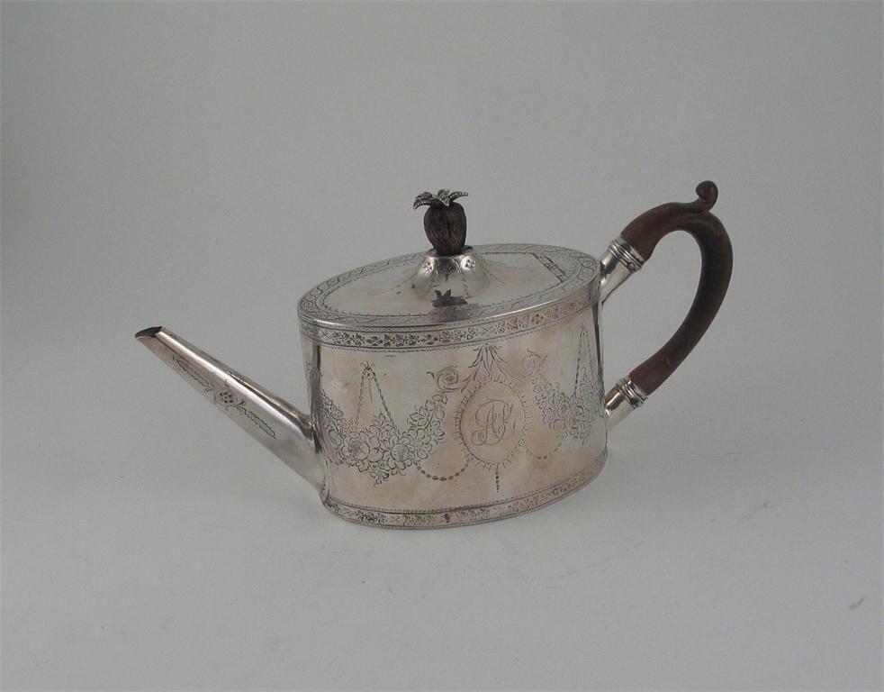 A George III bright-cut oval teapot with a straight spout, and mounted wooden pineapple finial, initialled and inscribed on the base, "Made at the Silver Lyon Foster Lane, London", by Thomas Daniel, London 1785, 12oz.