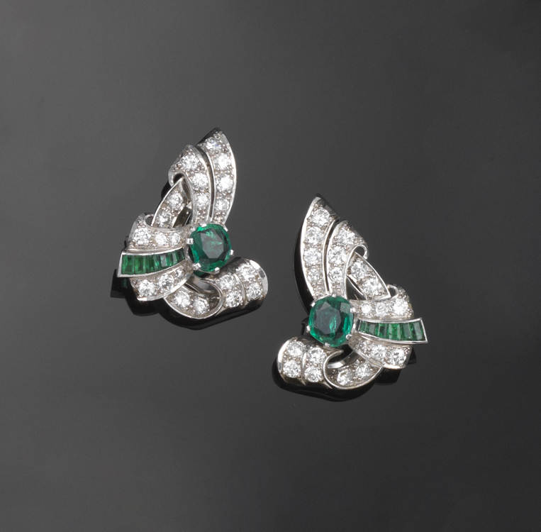 A pair of emerald and diamond scroll earrings