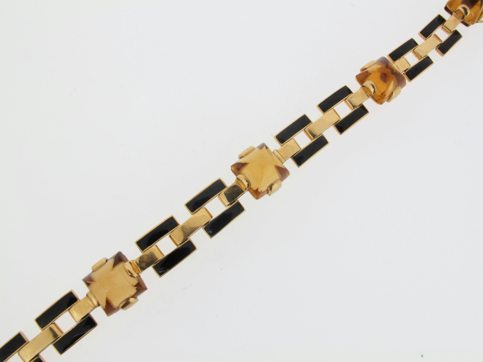 A French Art Deco bracelet, the stylised tank track bracelet with enamel decoration to the outer links and mounted with four citrines. French control mark. 19cm. 45g in total.