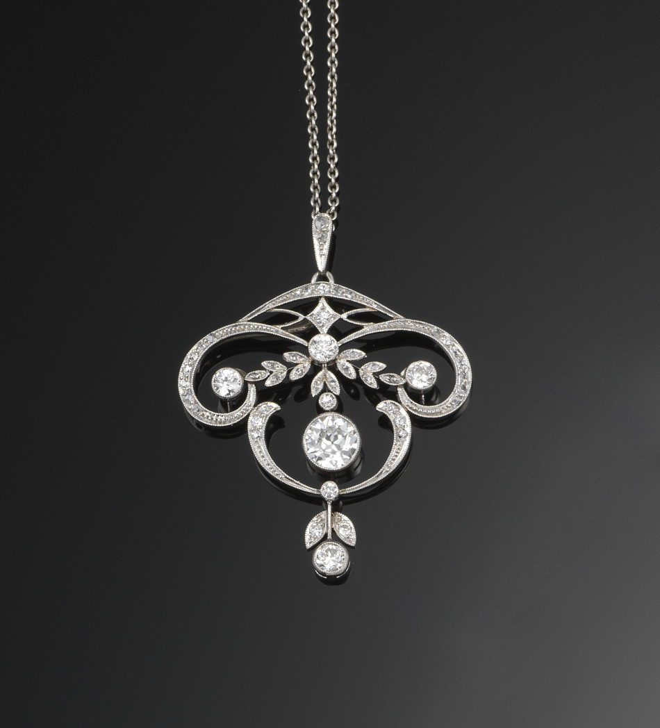 A Belle Epoque diamond pendant, set overall with graduated diamonds and with laurel decoration. The principle round old brilliant cut diamond weighs approximately 1.05cts, set in platinum and gold, on a fine link platinum neck chain.