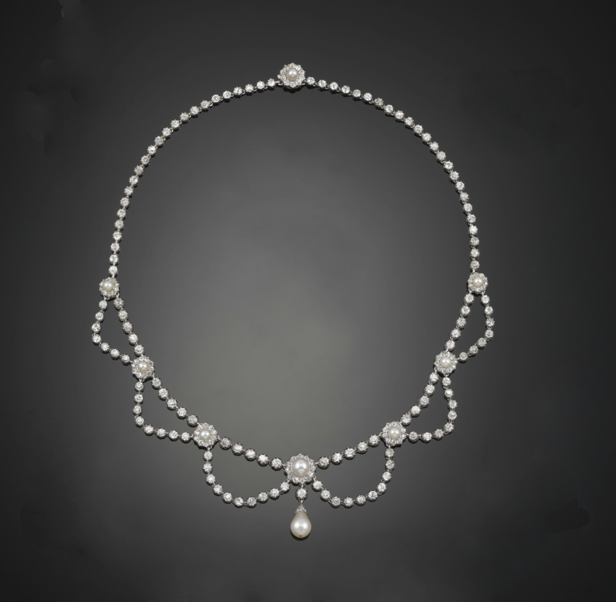 An Edwardian diamond and pearl festoon necklace, formed as a row of circular cut diamonds with six diamond set swags suspended from the pearl and diamond clusters, the centre cluster suspends a drop shaped pearl. With pearl and diamond cluster clasp. The diamonds set in cut down silver and gold collets. 41cm. Fitted case by Hunt and Roskell. Accompanied with certificate number 06202 from The Gem and Pearl Laboratory dated 4th September 2012 stating that: 1) The drop shaped drilled pearl measures 7.0 - 7.1mm wide by 9 - 10mm long and is a natural saltwater pearl. 2) The largest part-drilled button shaped pearl measures 6.1 - 6.3 x 5.6mm. The necklace weighs 27.86g (total)